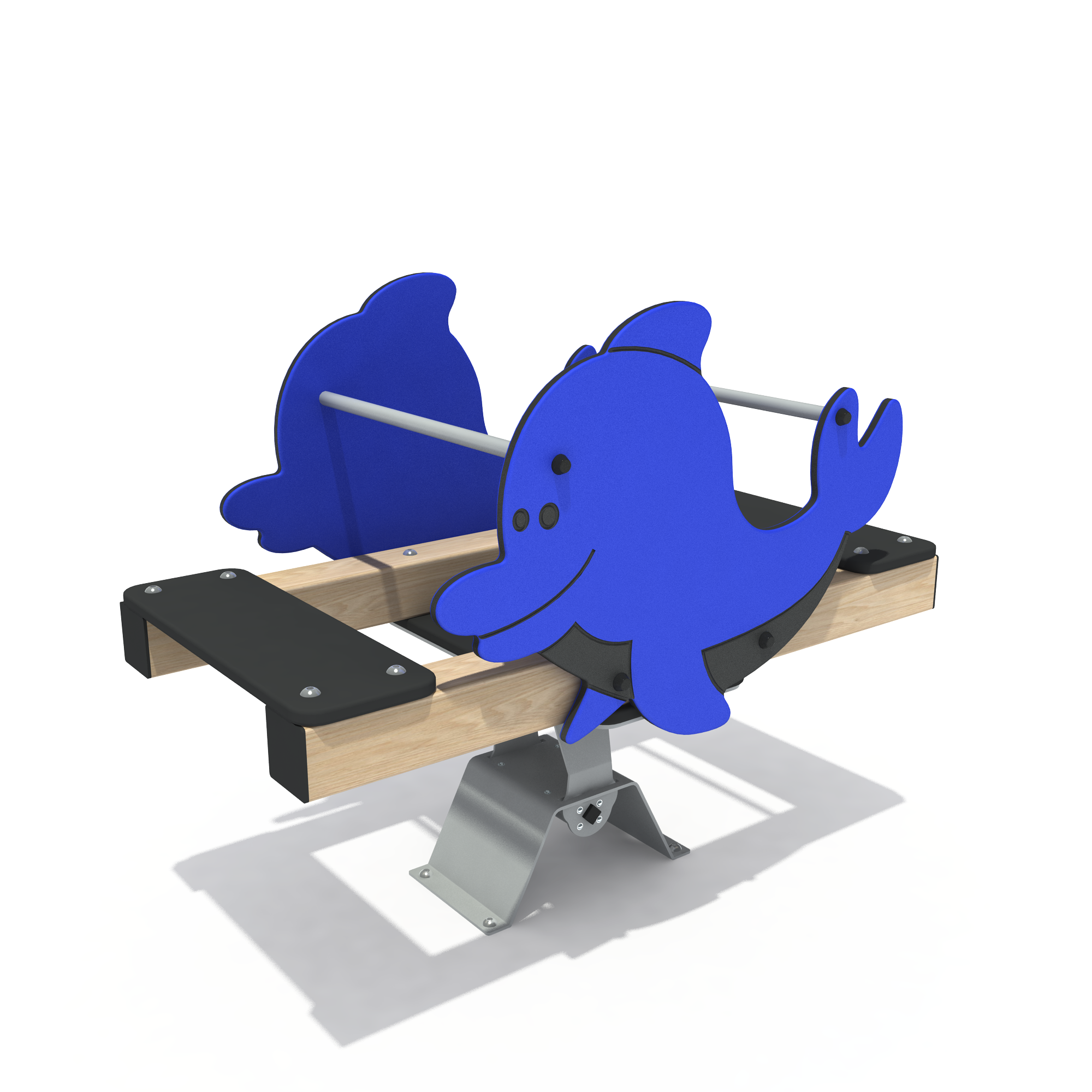 Playful Themed Design: The teeter-totter features two friendly cartoon dolphins at its ends, with their fins extended as if they are rocking up and down with the children. This unique design quickly captures kids' attention and adds a lively sea creature to the playground.