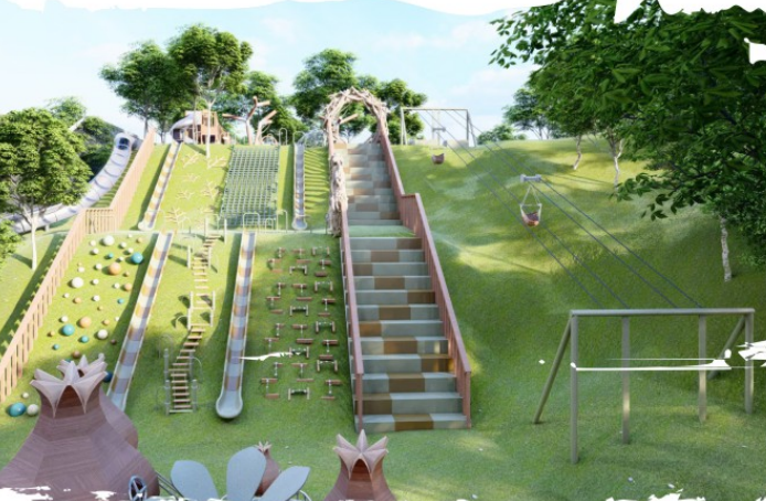 Harness the Power of NatureThe Hillside Adventure Playground System redefines outdoor play by using the natural topography to create an engaging, multi-faceted experience. Instead of building on flat ground, this design leverages hills to create a series of thrilling descents and challenging climbs. Children can race down different types of slides, from classic wavy slides to sleek stainless steel tube slides, each offering a unique ride.