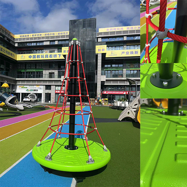 2. Product material: The plastic parts of this product are made of environmentally friendly engineering plastic LLDPE, which is formed by rotational molding in one go. It is safe, odorless, strong and durable. The middle part uses a galvanized pipe with a diameter of 89mm, and the surface is treated with high-temperature electrostatic powder spraying. The color is long-lasting and not easy to fade. The periphery uses a 16mm diameter nautical rope, which is solid and durable. The base fixing bracket uses a galvanized square tube, and the surface of the bracket is electrostatically powder sprayed. The powder spraying material uses a low metal content material that meets national safety standards. The internal bearing uses a high-precision bearing, which is durable, quiet, and has high speed characteristics. Screws: Made of stainless steel 304, using semi-circular head hexagonal safety screws.